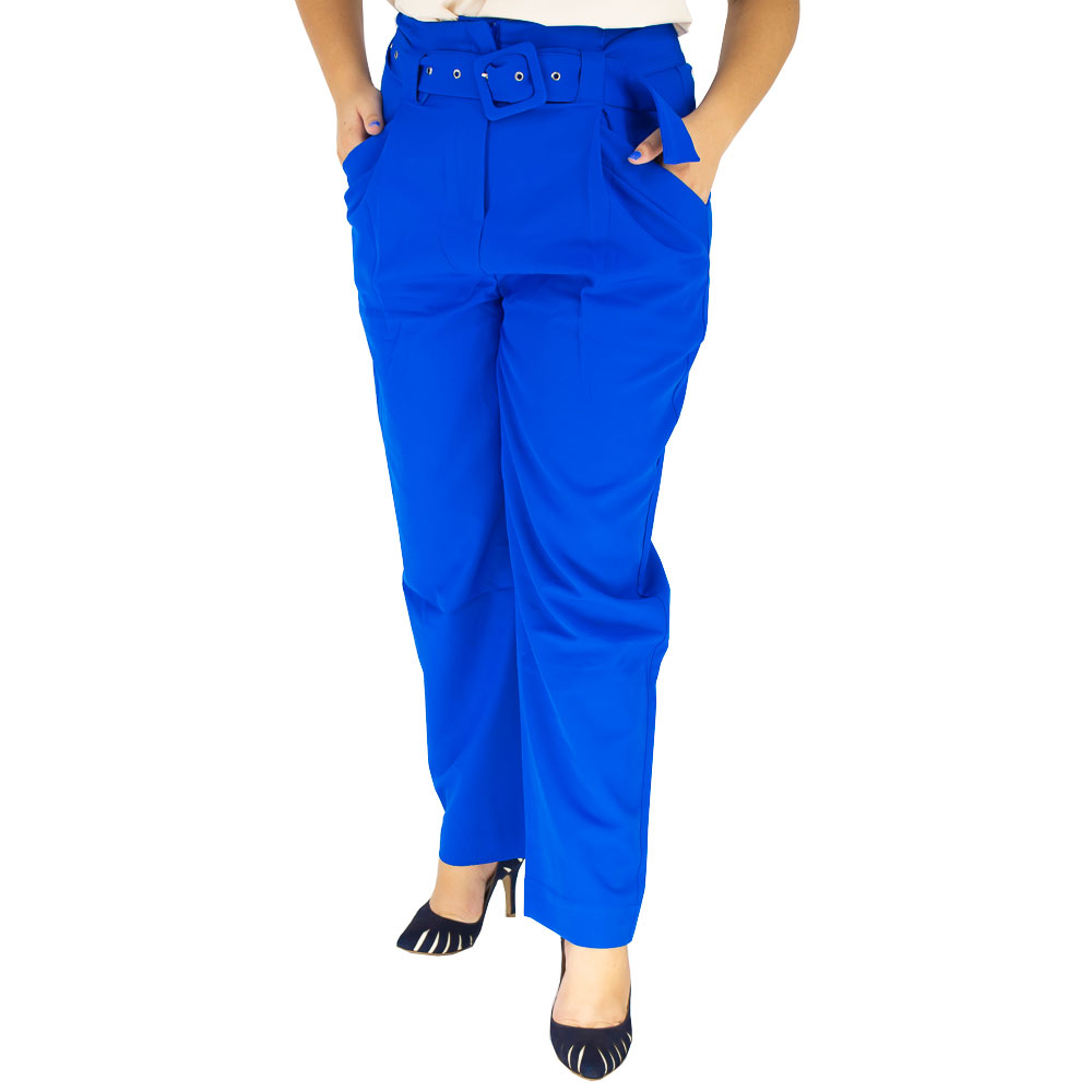 Confeccionada em alfaiataria. Modelagem baggy, com cintura alta, mais larga a partir do quadril, contém bolso faca e traseiro, fechamento em zíper e botão, acompanha cinto do próprio tecido.
