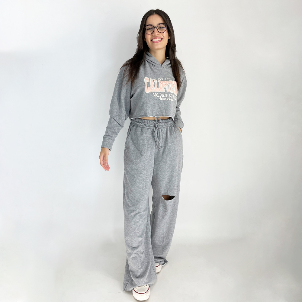 Cropped manga longa com capuz e punho. Calça com cordão para amarração, elástico no cós, cintura alta, bolsos laterais, modelo estilo wide leg com rasgo na altura do joelho. Conjunto em moletom surper confortável além de ser lindíssimo!