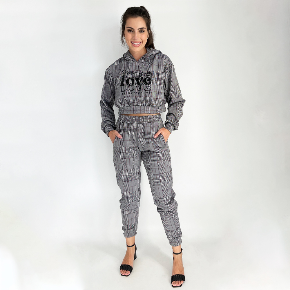 Cropped com capuz, estampa com bordado impecável, mangas com punho e barra mais justos no corpo. Calça cintura alta, cós em elástico trazendo muito conforto, bolsos nas laterais e barra com ribana.