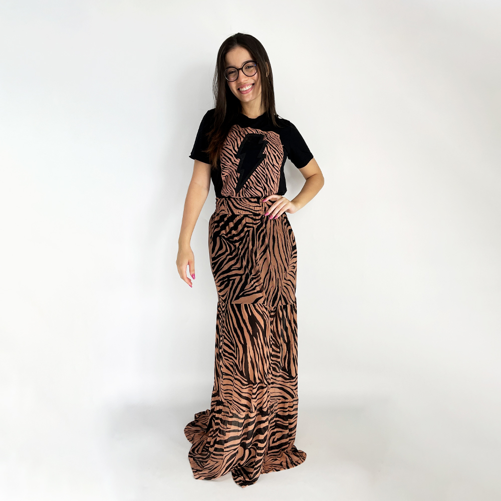 Conjunto de saia e blusa com estampa raio. Saia em tule, possui forro na parte do quadril, elástico na cintura e blusa modelo T-shirt, tecido leve, look simplesmente maravilhoso!