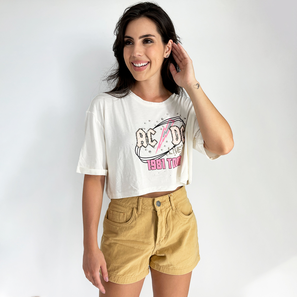 Cropped de tecido super leve, estampa AC/DC bordado à mão, versátil e fácil de combinar looks. Peça indispensável no guarda-roupas das fãs de uma das maiores bandas do Rock!