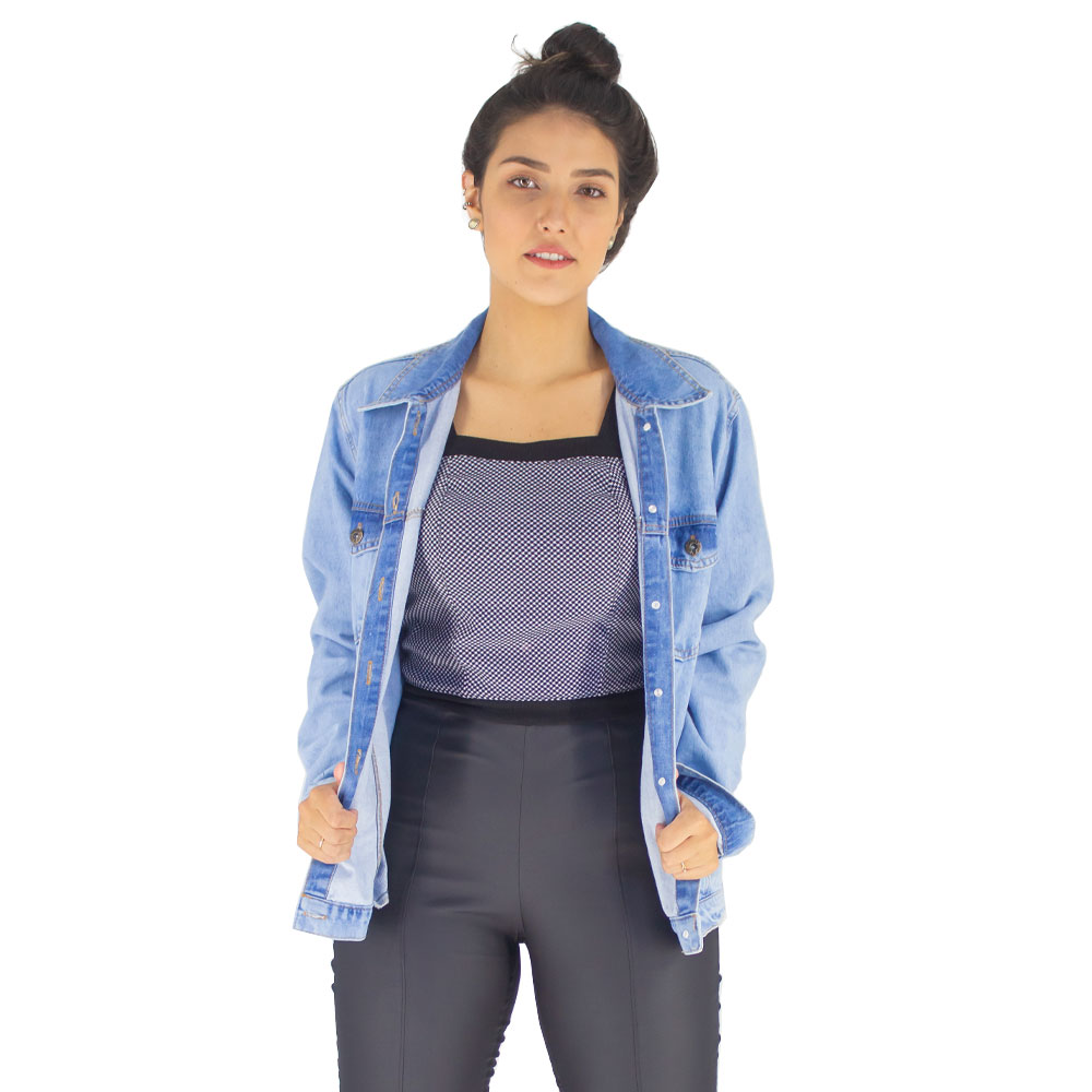Jaqueta jeans feminina atemporal de comprimento regular, fechamento frontal com botões, possui dois bolsos na região do busto e botõe nos punhos. Item versátil e essencial, pois combina com todo seu guarda-roupa!