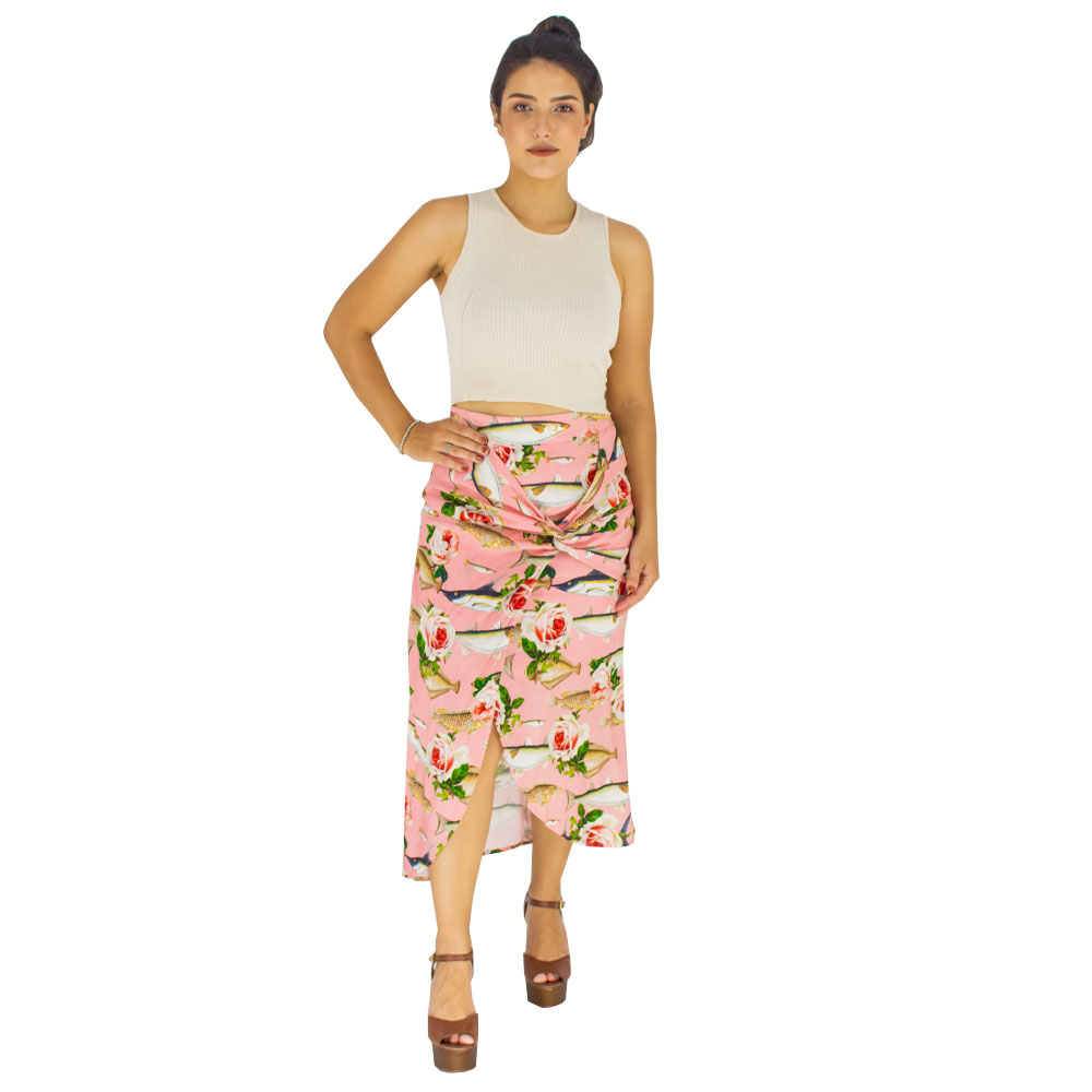100% Viscose. A Saia Midi Nó Frontal Mamô é linda, álem de oferecer movimentos, proporciona leveza e fluidez.