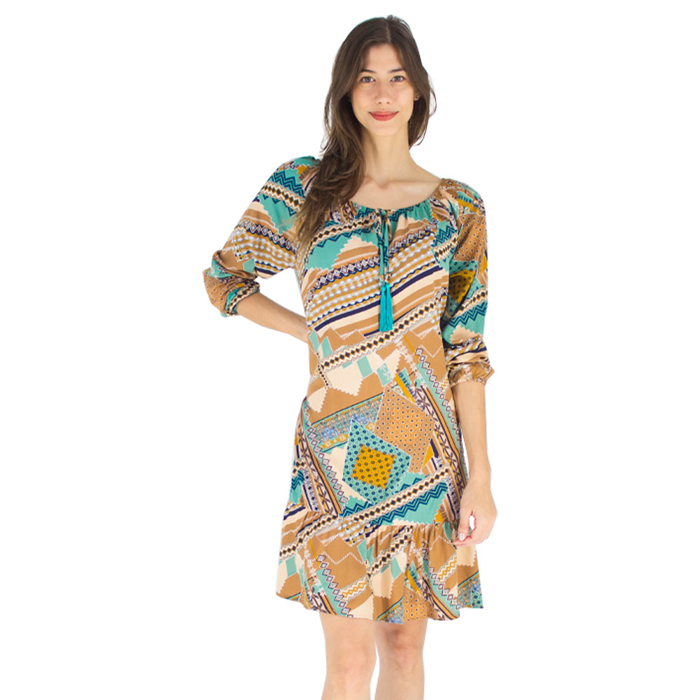 Vestido Fiveblu estampado com manga longa, possui elástico nos punhos, decote ombro a ombroe e tira com enfeites nas pontas.