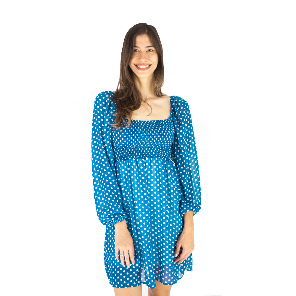 Vestido curto em estampa de poá, elástico nos punhos, lastex na região do busto e possui forro no comprimento. Mangas longas e bufantes, tecido leve e decote quadrado. Look confortável e diferenciado!