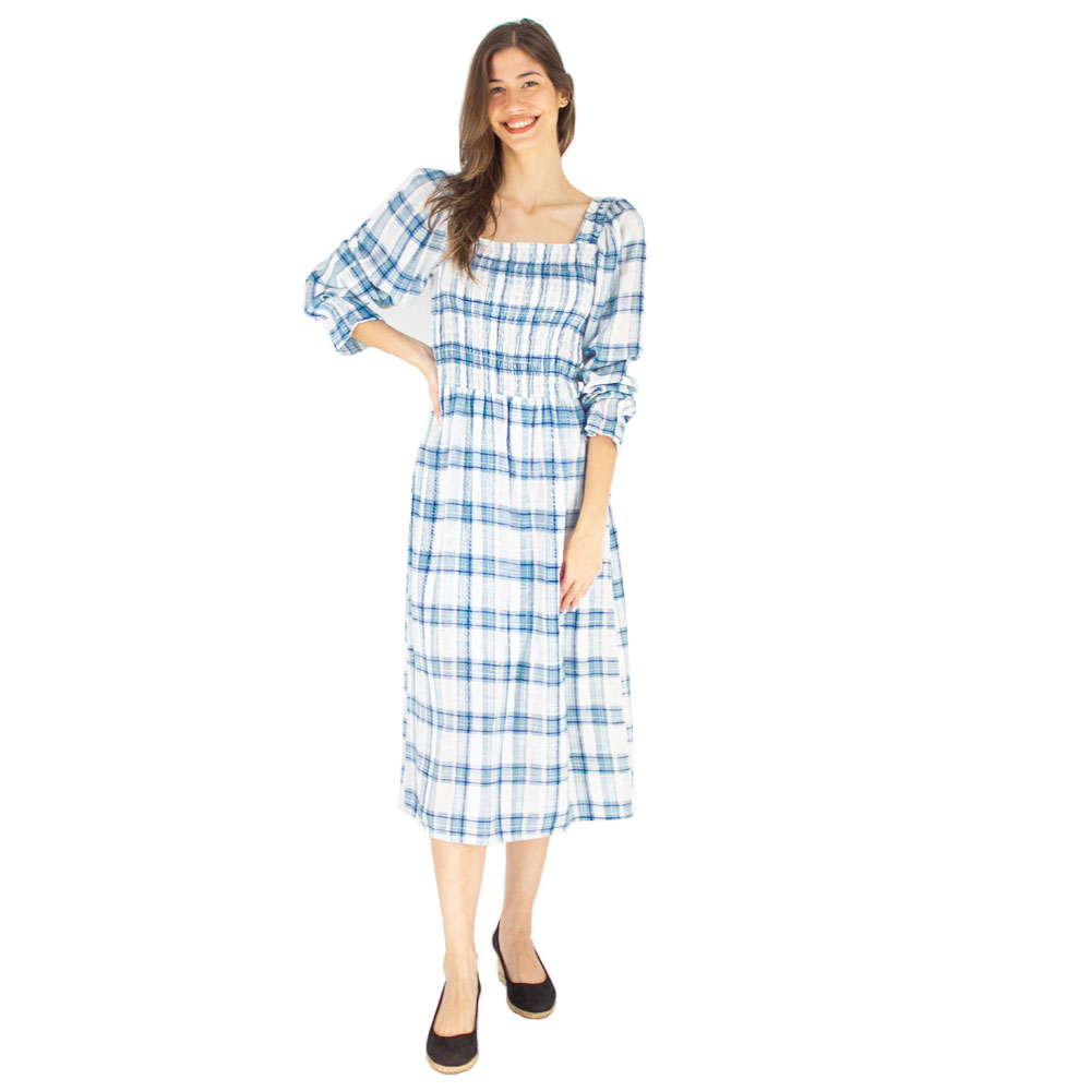 Vestido longo com lastex até a cintura, possui manga comprida com elástico nos punhos, decote quadrado.